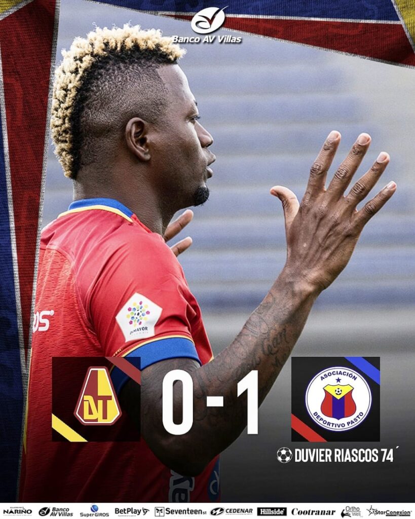 Con un golazo de Duvier Riascos en el minuto 28 del segundo tiempo, tras un pase largo de Mariano Vásquez, Deportivo Pasto que jugó muy bien, venció 1-0 en Ibagué al Deportes Tolima, y llegó a 18 puntos tras la jornada 16 de la Liga colombiana.
