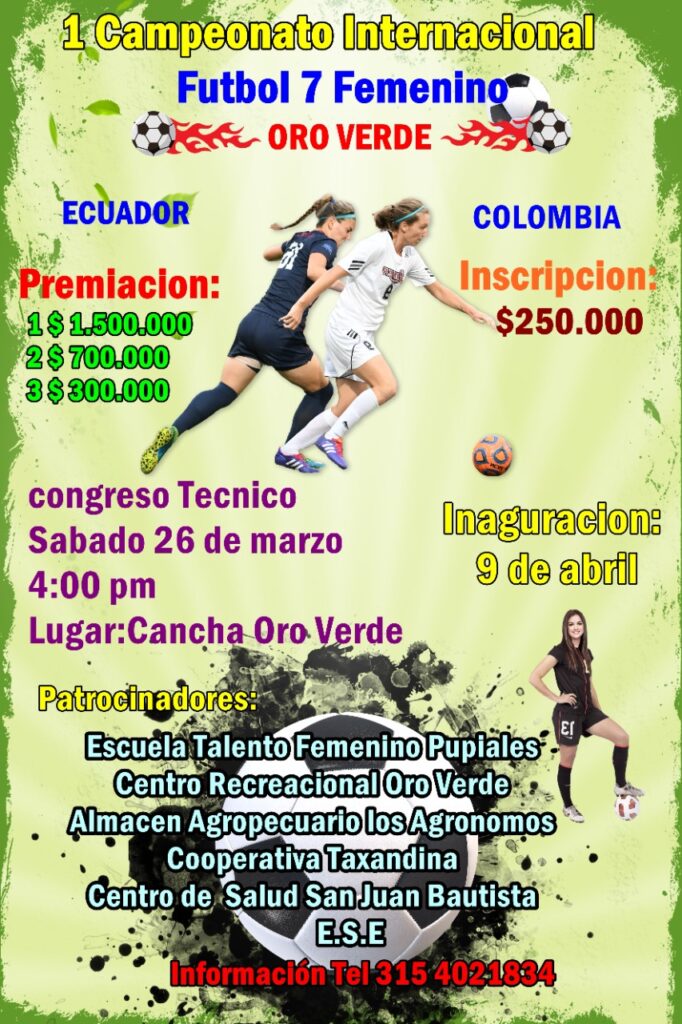 El próximo sábado 2 de abril sobre las cuatro de la tarde en las instalaciones del centro empresarial y recreacional Oro verde de Pupiales se llevará a cabo el congreso técnico del Primer Campeonato internacional femenino de futbol 7.